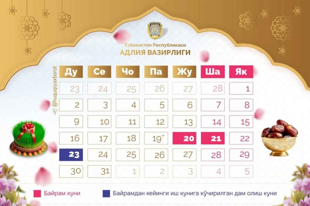 Ўзбекистонда Рамазон ҳайити ва Наврўз байрамлари муносабати билан кетма-кет тўрт кунгача дам олиш кунлари кўзда тутилган. Бу ҳақда Адлия вазирлигининг…