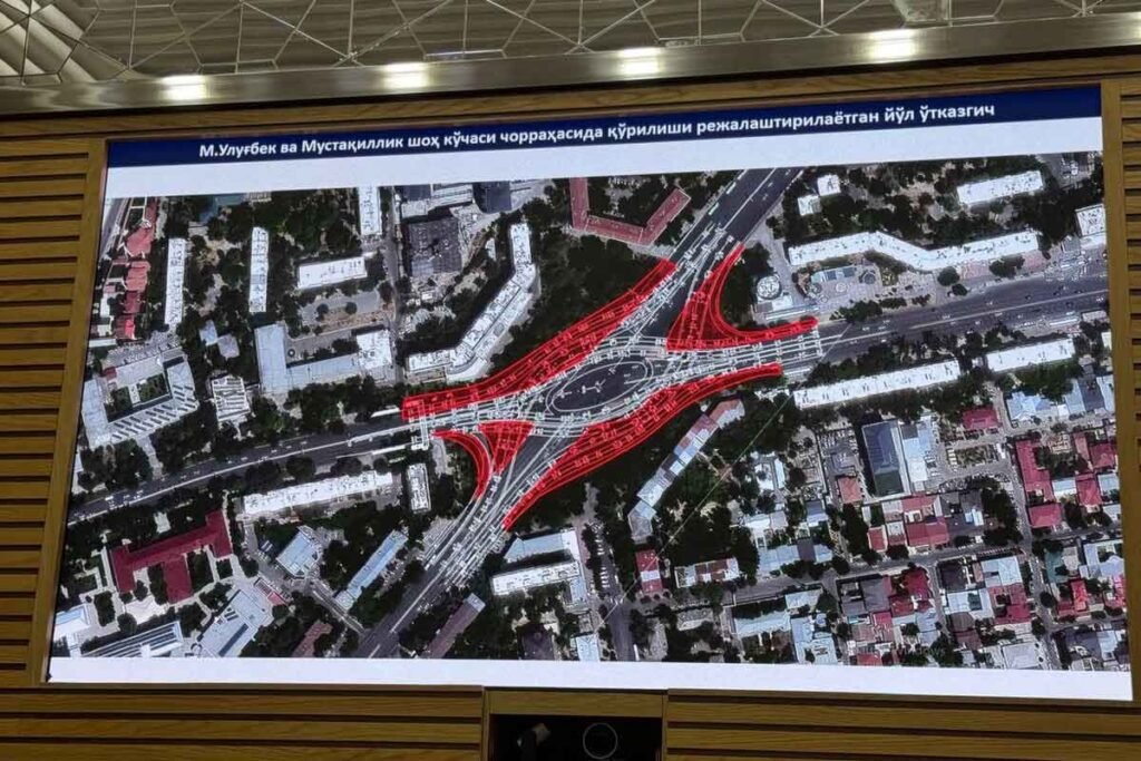Мустақиллик шоҳкўчаси, Мирзо Улуғбек ва Буюк ипак йўли кўчалари кесишмасида («Буюк ипак йўли» метро бекати) икки даражали автомобиль йўл ўтказгичи…