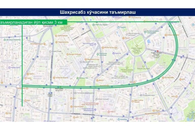 Тошкентдаги Шаҳрисабз кўчасининг бутун узунлиги бўйлаб (Grand Mir меҳмонхонаси ёнидаги айланма йўлдан Амир Темур шоҳкўчаси билан кесишгунча) — бу 3 кмни…