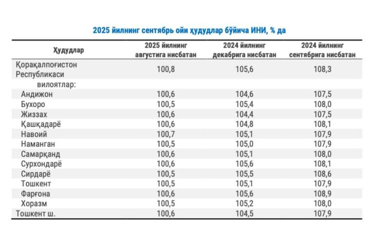 2025 йил сентябрь ойи якунларига кўра, Ўзбекистонда инфляция 0,6% ни ташкил этди. Бу Статистика бўйича Миллий қўмита маълумотларидан келиб чиқади.…