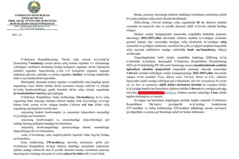 Солиқ қўмитаси ижтимоий тармоқларда банкларга Ўзбекистондан хорижий интернет-компаниялар фойдасига амалга оширилган тўловлар тўғрисида маълумот тақдим этиш бўйича сўровлар юборилгани ҳақида…
