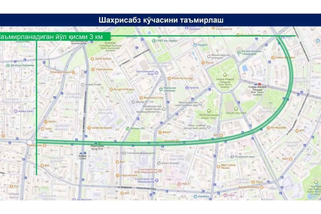Тошкентдаги Шаҳрисабз кўчасининг бутун узунлиги бўйлаб (Grand Mir меҳмонхонаси ёнидаги айланма йўлдан Амир Темур шоҳкўчаси билан кесишгунча) — бу 3 кмни…