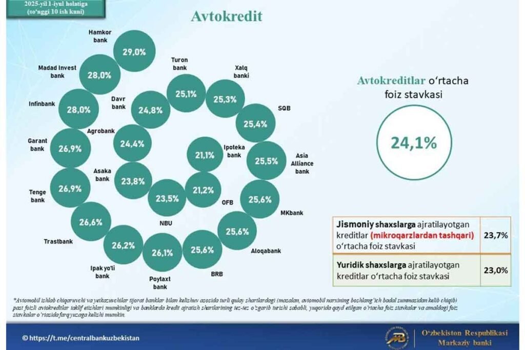 2025 йил 2 июлдан бошлаб Ўзбекистон Марказий банки турли кредит турлари бўйича банклар кесимида ўртача фоиз ставкалари ҳақидаги маълумотларни тажриба…