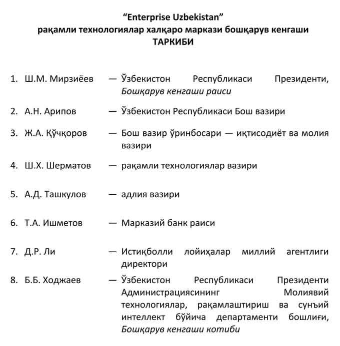 2024 йил февраль ойида президент Халқаро рақамли технологиялар марказини (International Digital Technology Center — Enterprise Uzbekistan) ташкил этиш тўғрисидаги фармонни имзолаган эди.