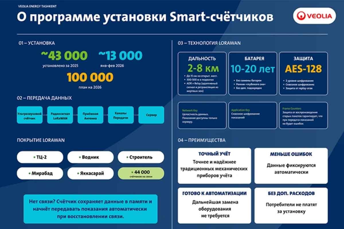 Тошкентда иссиқ сув таъминоти тизимини модернизация қилиш дастури доирасида маълумотларни масофадан узатувчи замонавий ультратовуш (smart) ҳисоблагичлари босқичма-босқич жорий этилмоқда. Veolia Energy Tashkent компанияси ушбу қурилмаларни ўрнатиш жараёни ва уларнинг ишлаш тамойиллари ҳақида батафсил маълумот берди.