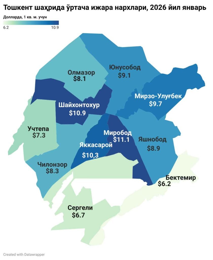 2026 йил январь ойида Тошкентда уй-жой ижарасининг ўртача нархи 1 кв. м учун қарийб 8,8 долларни ташкил этди — бу 2025 йилги даражадан 9 фоизга юқори.