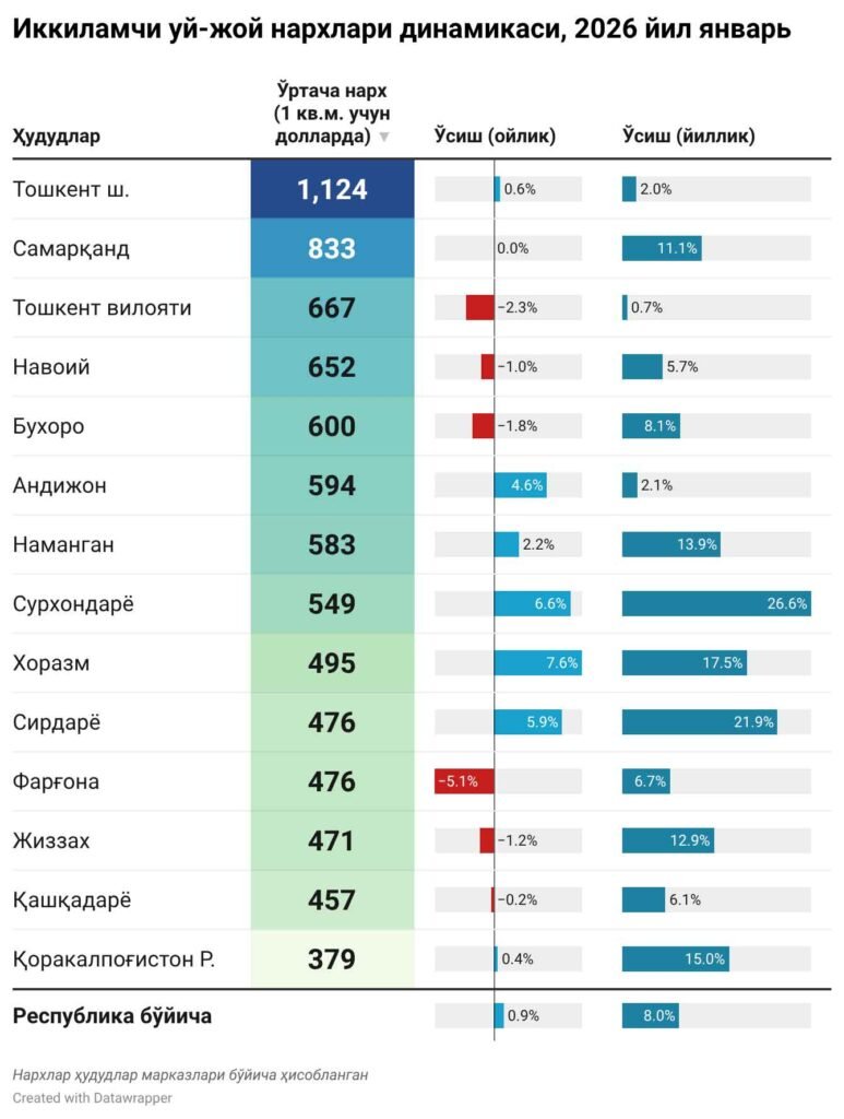 Тошкентнинг иккиламчи уй-жой бозорида январь ойида 1 кв. м нинг ўртача нархи қарийб 1120 долларни ташкил этди. Бир ойда нархлар 0,6 фоизга, йиллик ҳисобда эса деярли 2 фоизга ошган.