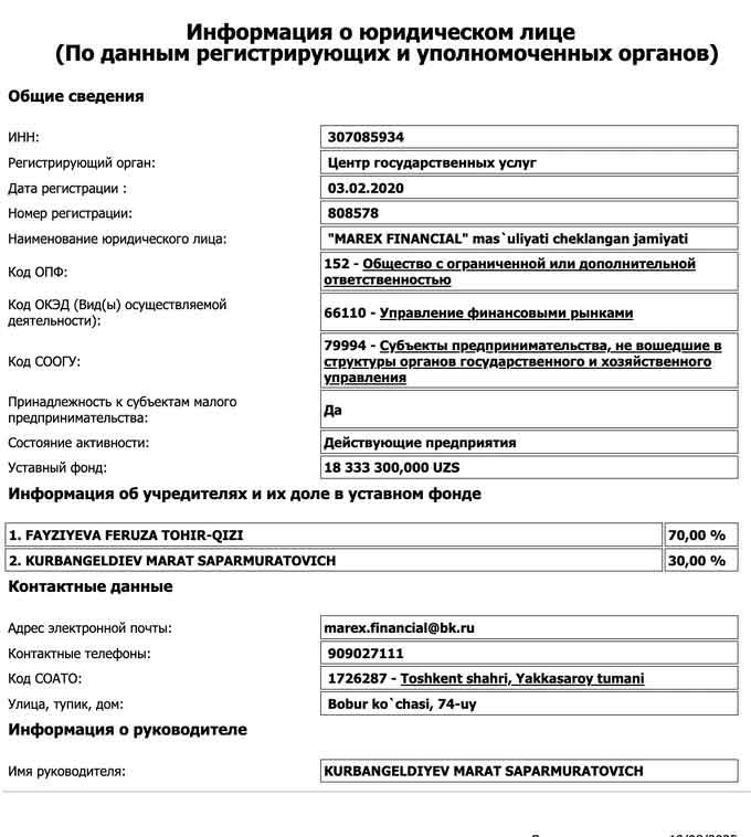 Бундан ташқари, Файзиева 2020 йилда ташкил этилган ва молия бозорларини бошқариш билан шуғулланувчи Marex Financial компаниясида 70% улушга эгалик қилади. Компаниянинг устав капитали 18,33 млн сўмни ташкил этади.