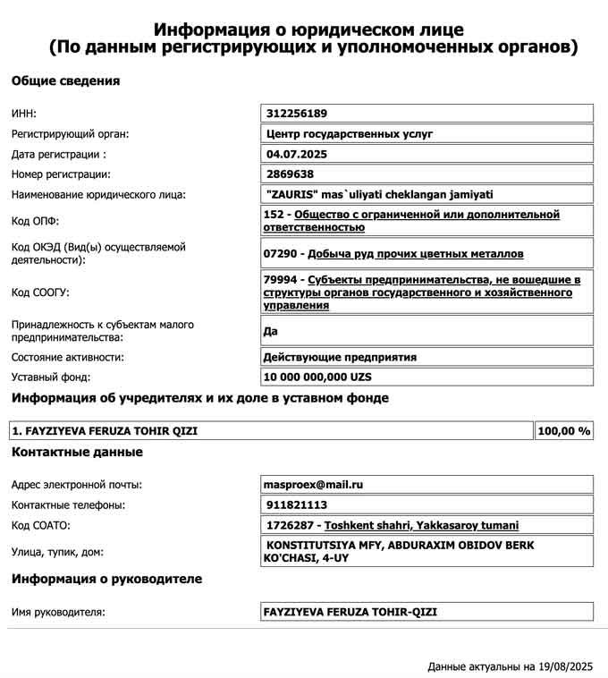 Корхоналар ва ташкилотларнинг ягона давлат реестри (КВТЯД) маълумотларига кўра, Zauris компанияси 2025 йилнинг июль ойида Тошкентда рангли металлар рудаларини қазиб олиш фаолияти билан шуғулланиш учун рўйхатдан ўтказилган. Корхонанинг муассиси ва раҳбари 10 млн сўм миқдоридаги устав капиталининг 100% эгалик қилувчи Феруза Файзиева.