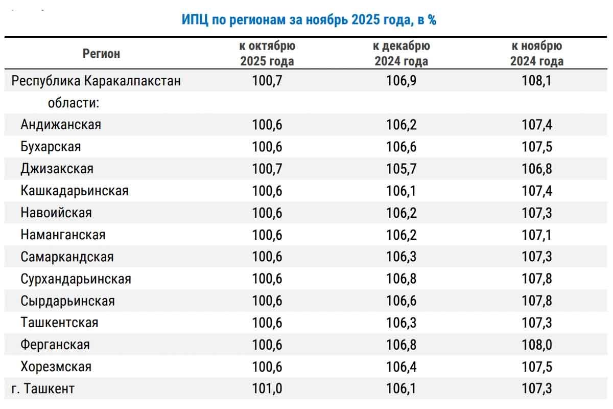 Энг юқори йиллик инфляция суръатлари Қорақалпоғистон (8,1 фоиз) ва Фарғона вилоятида (8 фоиз) қайд этилди. Тошкент шаҳрида бу кўрсаткич 7,3 фоизни ташкил этиб, республика ўртача даражасига яқин.