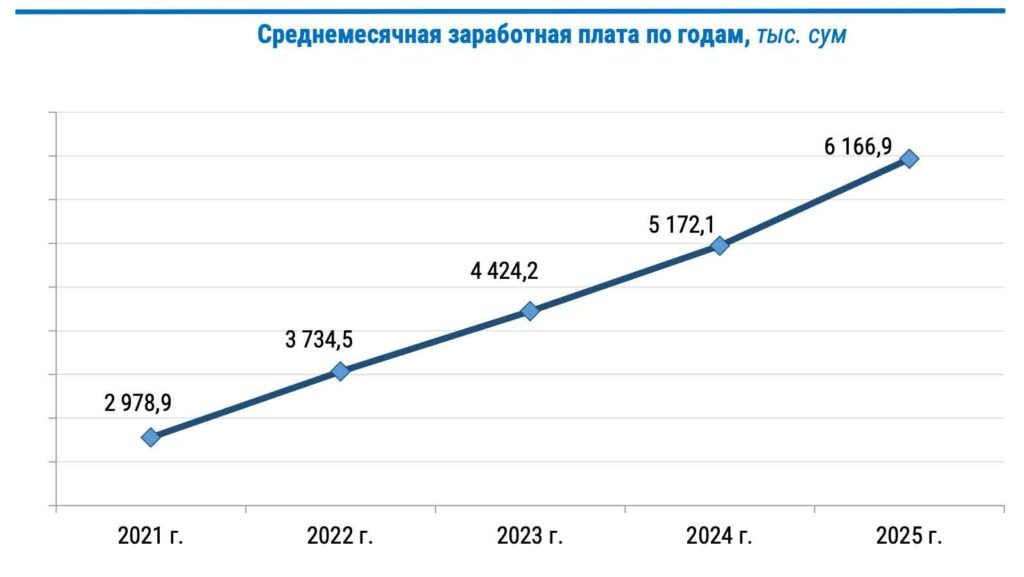 Ўсиш 2024 йилги кўрсаткичга (5,17 млн сўм) нисбатан тезлашди. Йилдан йилга инфляцияни (8%) ҳисобга олган ҳолда, иш ҳақининг реал ўсиш суръатлари 11,2% ни ташкил этди. Таққослаш учун: 2024 йилнинг 9 ойида номинал иш ҳақи 16,4% га ўсган (инфляция 10,5% бўлган ҳолда).