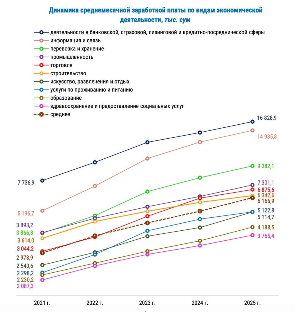 Энг юқори ўртача иш ҳақи молия секторида (банк, суғурта, лизинг, кредит-воситачилик фаолияти) — 16,8 млн сўм (+15,6%), шунингдек, АКТ ва алоқа соҳасида — 14,99 млн сўм (+16,6%) сақланиб қолмоқда.