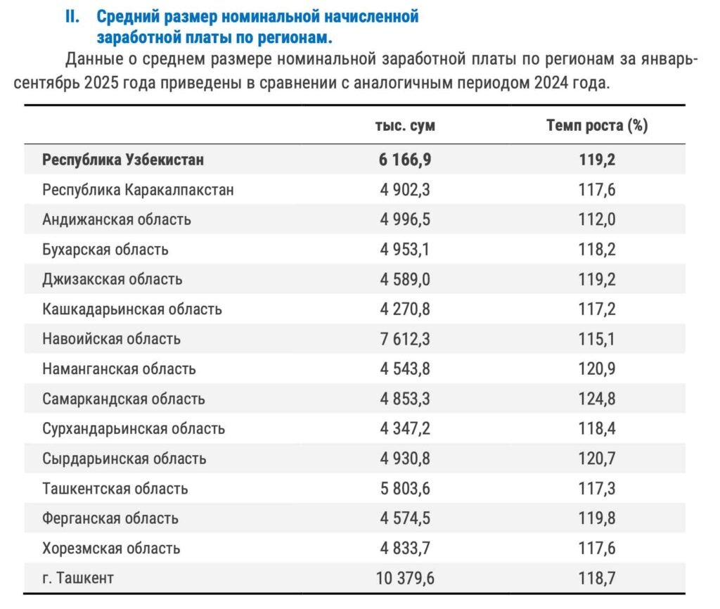 2025 йил январь-сентябрь ойлари якунларига кўра, Ўзбекистонда ўртача ойлик иш ҳақи 6,16 млн сўмни (ёки тахминан $511,2) ташкил этди. Бу 2024 йилнинг шу даврига нисбатан 19,2% га кўп, дея хабар берди Статистика бўйича Миллий қўмита.