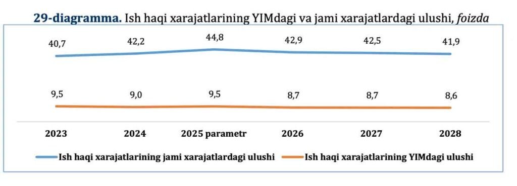Кутилишича, бюджет тузилмасидаги иш ҳақи харажатларининг улуши (ижтимоий солиқлар билан бирга) 2026 йилда жорий йилда прогноз қилинган ЯИМга нисбатан 9,5% дан 8,7% гача пасаяди ва умумий давлат харажатларининг тахминан 42,9% ини ташкил этади (жорий йилда 44,8% прогноз қилинган).