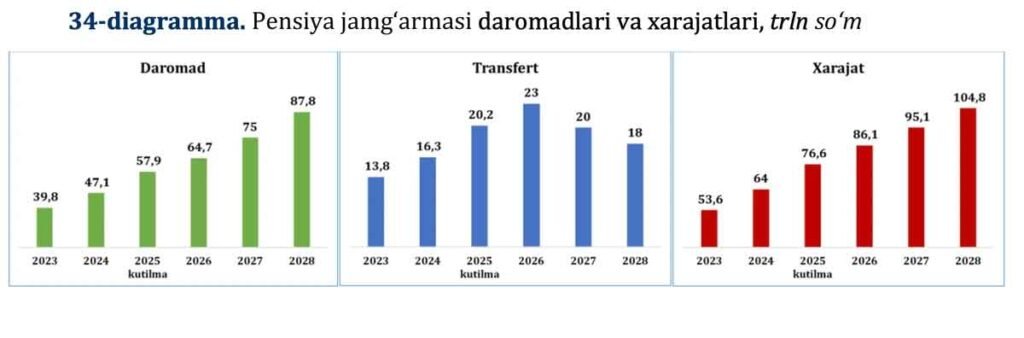 2026 йил бошига келиб, Пенсия жамғармаси маблағларининг қолдиғи 3,9 триллион сўм, даромадлари — 64,7 триллион сўм, харажатлари — 86,1 триллион сўм миқдорида прогноз қилинмоқда. 2026 йилда дефицитни қоплаш учун бюджетдан 23 триллион сўм ажратилиши режалаштирилган — бу жорий йилда кутилаётган (20,2 трлн) миқдордан 13,9% кўп.
