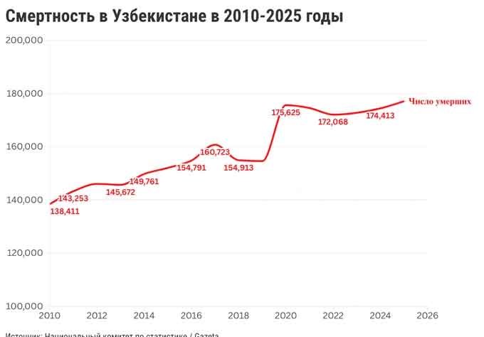 2025 йил давомида вафот этганлар сони 177,1 минг кишига етди, бу 2024 йилдагига нисбатан тахминан 2700 кишига кўп. Аҳолининг табиий ўсиши 702,5 минг кишини ташкил этди (2024 йилда — 743,4 минг, 2023 йилда — 789,2 минг).