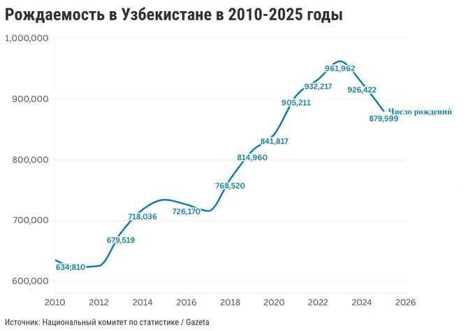 Ўзбекистонда 2025 йилда туғилишлар сони 2020 йилдан буён илк бор 900 мингдан пастга тушиб, 879,6 мингни ташкил этди. Бу Статистика агентлиги маълумотларида акс этган.