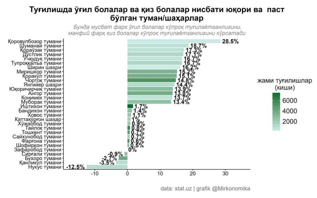 2025 йилда мамлакатда 454,7 минг нафар ўғил бола (улуши 51,7 фоиз, ўтган йилги 51,9 фоизга нисбатан) ва 424,9 минг нафар қиз бола (48,3 фоиз, ўтган йилги 48,1 фоизга нисбатан) дунёга келди. Шундай қилиб, республика бўйича ўртача ҳар 100 нафар қиз болага 107 нафар ўғил бола тўғри келди. Миркомил Холбоевнинг фикрича, бу табиий даражадан бироз юқори. 2024 йилда ўртача ҳар 100 қизга 107,3 ўғил тўғри келган эди.