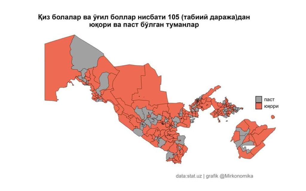 Туман ва шаҳарлар кесимида энг катта номутаносиблик Қоровулбозор туманида (ҳар 100 қизга 128,5 ўғил), Шуманай (118,7) ва Қораўзак туманларида (117,3) рўйхатга олинган. Энг кам ўғил болалар Нукус шаҳрида (ҳар 100 қизга 87,5 ўғил), Қонликўл (96,5) ва Бухоро туманларида (97,3) туғилган.