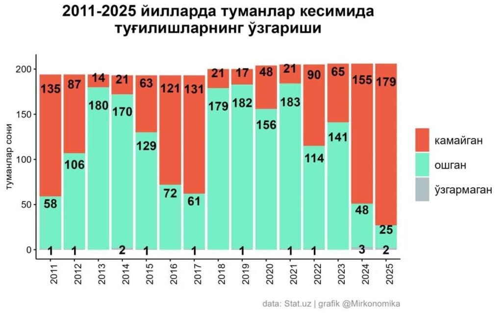 Иқтисодчи, Жанубий Кореянинг Чонбук миллий университети «Халқаро савдо» йўналиши магистри Миркомил Холбоевнинг ҳисоб-китобларига кўра, 2025 йилда 179 та туман ва шаҳарда туғилишнинг камайиши қайд этилган — бу охирги 15 йилдаги энг юқори кўрсаткич. Таққослаш учун, 2024 йилда 155 та туманда пасайиш кузатилган бўлса, 2023 йилда бу кўрсаткич атиги 65 тани ташкил этган эди.