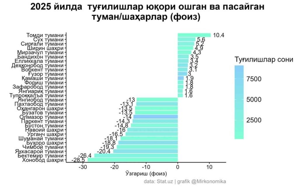 Туғилиш пасайган ҳудудларда туғилишлар сони 48,4 мингтага камайган ва улар мамлакат бўйича жами туғилишларнинг қарийб 90 фоизини ташкил этган. Туғилишнинг ўсиши атиги 25 та туманда кузатилиб, у ердаги умумий ўсиш 1 722 тани ташкил қилди. 2024 йилда ижобий динамикага эга туманларда ўсиш қарийб 9000 тага етган ва уларнинг жами туғилишдаги улуши 24 фоиз бўлган эди (2025 йилда — 8,6 фоиз).